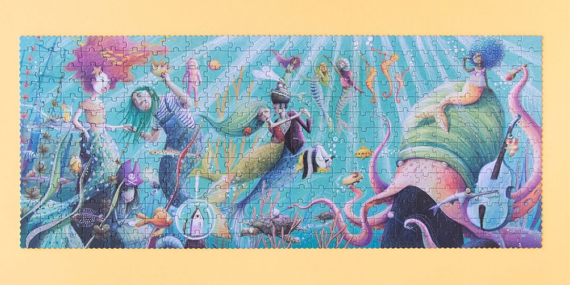 350 darabosMerüljetek el a sellők víz alatti birodalmában ezzel a 350 darabos kirakóval! A tenger mélyének mesés jelenete kirakás közben szépen kibontakozik, tele apró felfedeznivalóval. A kép néhány pontja finoman csillog, amitől az egész igazán különleges hangulatú.